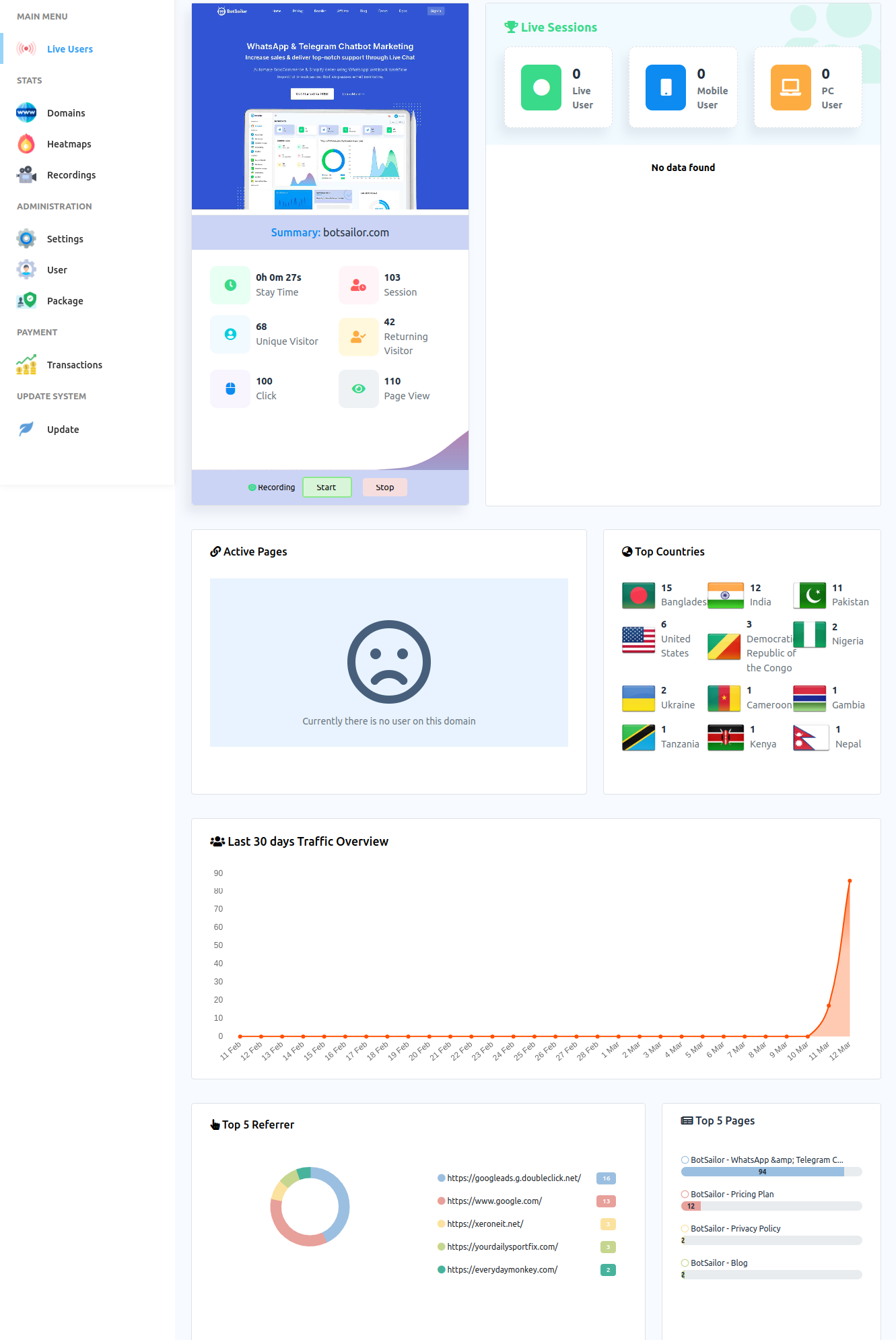 In the Live User section of HeatSketch, you can see the different types of information about live users and the interaction of live users with your website in graphical representation.