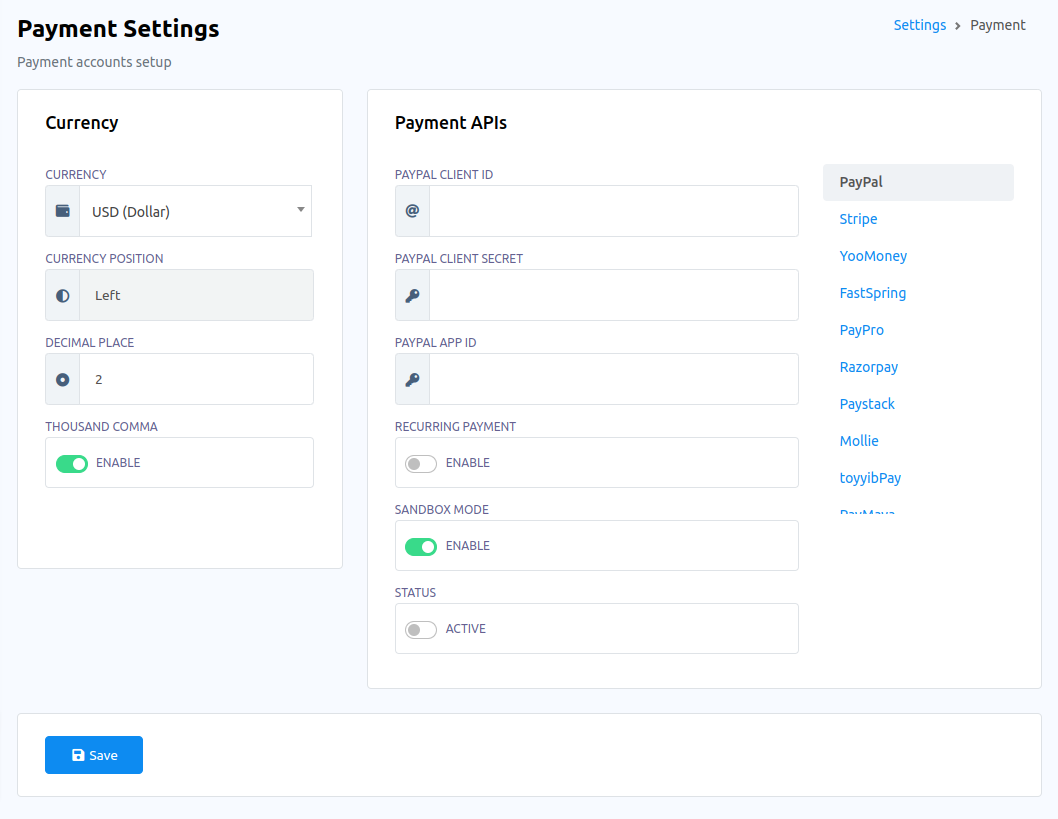- For example, select PayPal, and fill-out some fields and click on the save button.