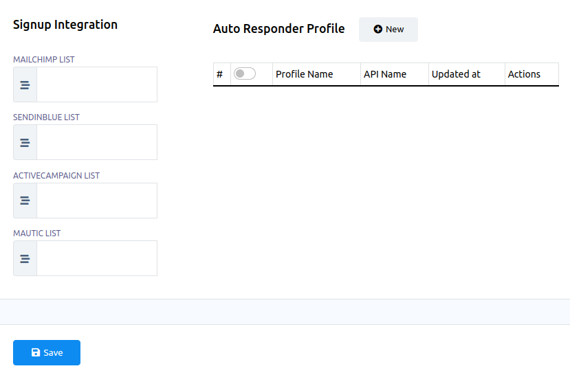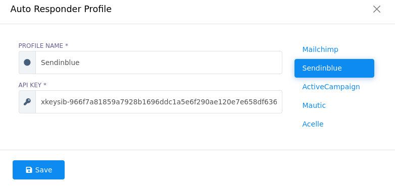For example, select Sendinblue, and fill-out some fields and click on the save button.