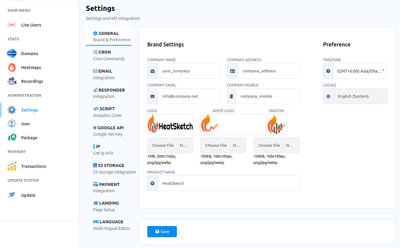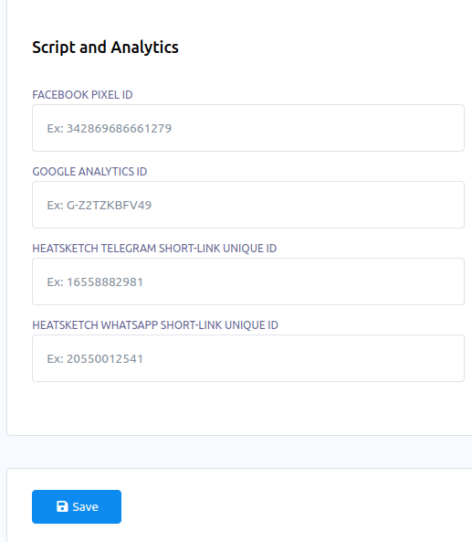Now go to the script and Analytics section and the Script and Analytics page will appear with some fields. If you want to set up Facebook and Google Analytics for your domain, enter Facebook Pixel Id and Google Analytics in the respective fields. Besides, if you can provide HeatSketch WhatsApp short-link unique ID and HeatSketch Telegram short-link unique ID in the respective fields.